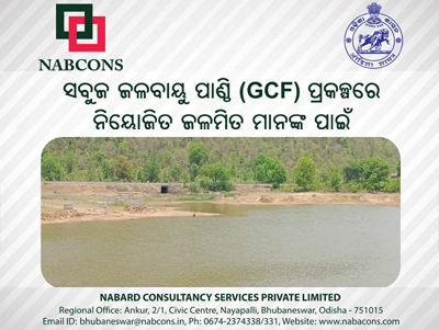 The Government of Odisha in partnership with National Bank for Agriculture and Rural Development (NABARD) is implementing "Ground water recharge and solar micro irrigation to ensure food security and enhance resilience in vulnerable tribal areas of Odisha; India, (Funded Activity: GCF-FP045)" through "Odisha Community Tank Development and Management (OCTDMS)", SPV under the DoWR. The GCF designated as an operating entity of the financial mechanism under Article 11 of the UNFCCC and established pursuant to the governing instrument having its Head Quarters at Songdo, Incheon, and Republic of Korea is assisting with a grant of USD 34.357 Million (Rs.226.76Cr) and Govt. of Odisha contribution (MGNREGA Convergence) will support the project with about 117.735 Million (Rs.777.05 Cr). There will be a community contribution of about USD 14.205 Million (Rs. 93.75Cr) through cash/ kind for the project.